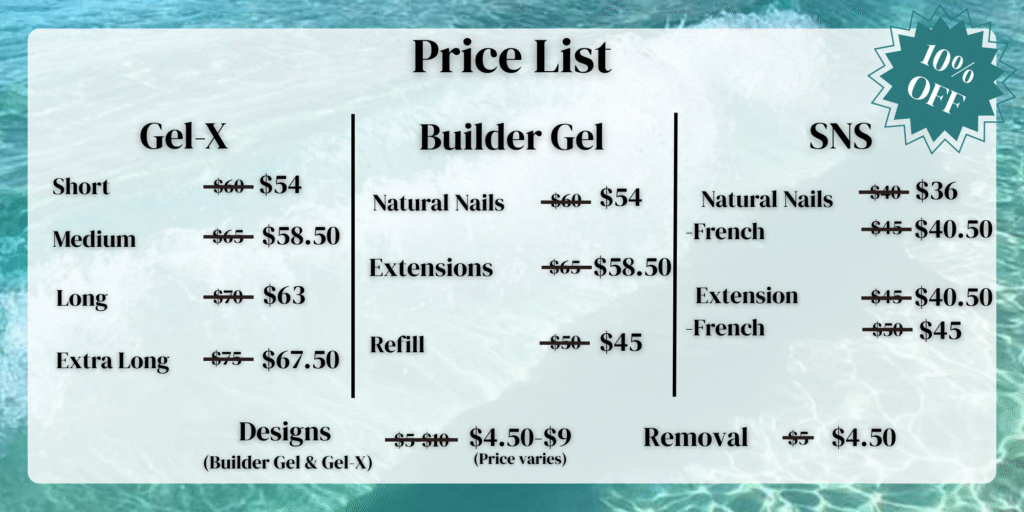 Take a look at the price list for our services! Waves of Beauty offers Gel-X, Builder Gel and SNS for every clients preference. Your nail health is our number 1 priority so prior to booking your appointment, feel free to send us an inquiry on what is best for your nails and to discuss what your nail goals might be! Builder Gel is the best for growing out your natural nails while keeping them healthy in the meantime. Gel-X is a great choice if you want a durable and long-lasting extension to the nail that is quick and easy to apply with minimal filing. SNS is a great choice for a solid colour or french tip, these are durable and long- lasting, with or without an extension. Contact us through our Email or Instagram if you have any inquiries!